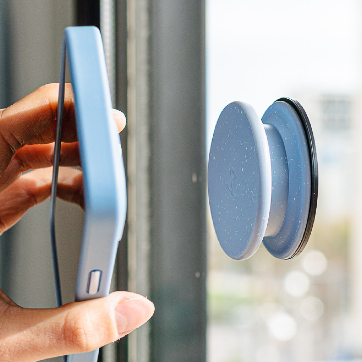 Sujeta fácilmente tu teléfono en cualquier espejo, cristal o superficie similar. Versátil, sin residuos y sin necesidad de baterías.